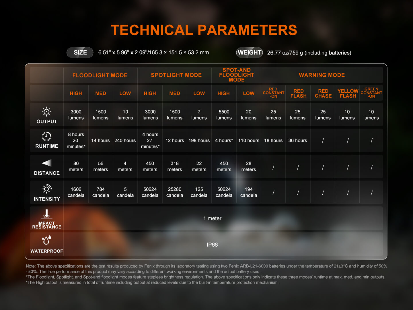 - Three options: spotlight, floodlight, or a combine both, with stepless brightness from 7 to 5500 lumens.