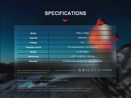 Fenix ARB-L21-6000 Rechargeable 21700 Battery With 6000mAh Power For High Drain Flashlights