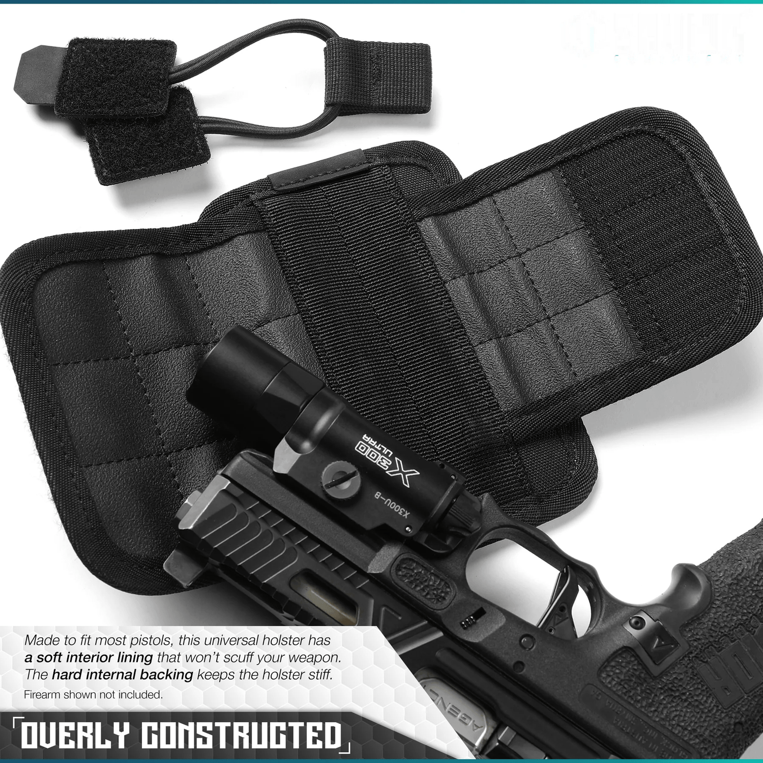 Never fiddle with an awkward fit again. This Universal Pistol Holder keeps pistols from Glock 42 up to the hulking Mark 23 snug, secure, and ready for action — whether you've got a weapon light, an RDS, or are rocking a minimalist setup.