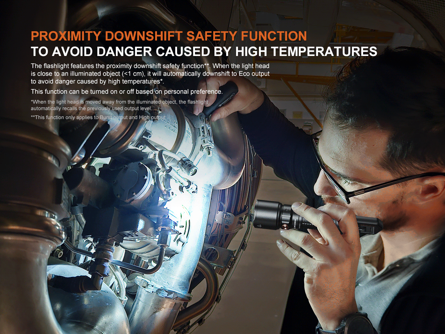 - Proximity sensor helps keep the light from overheating when it gets close to surfaces.